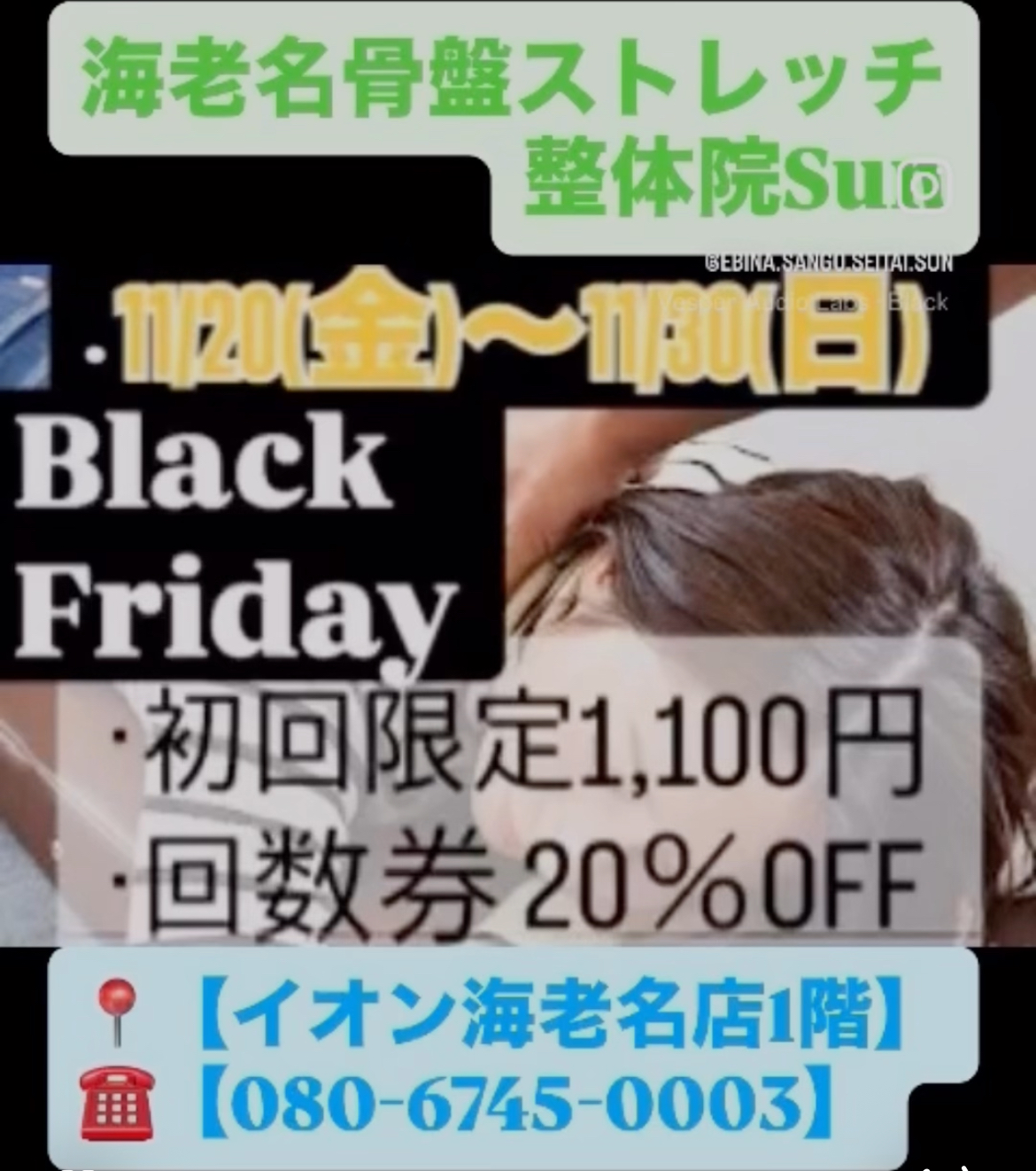 【Black Friday】開催中! 「海老名骨盤ストレッチ整体院Sun」はBlack Fridayを開催中です♪ 4,950円が→1,100円に! 他院との違いを実感してください♪